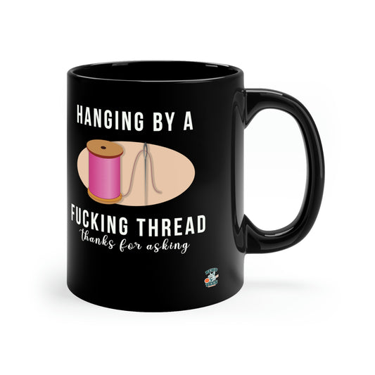 Hanging by a Thread 11oz Black Funny Mug